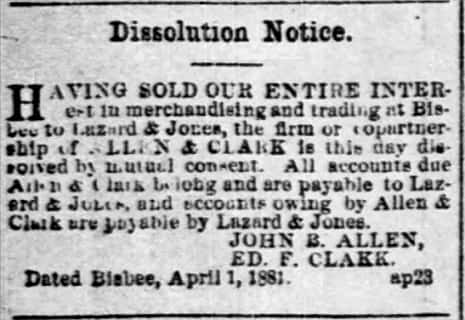 Meanwhile, John B. Allen was also in Bisbee, but sold out his partnership there by Spring 1881. He dabbled in many ventures, trying to build up his finances. Went back into some mining, bought & sold land. In the end he didn’t have much.
